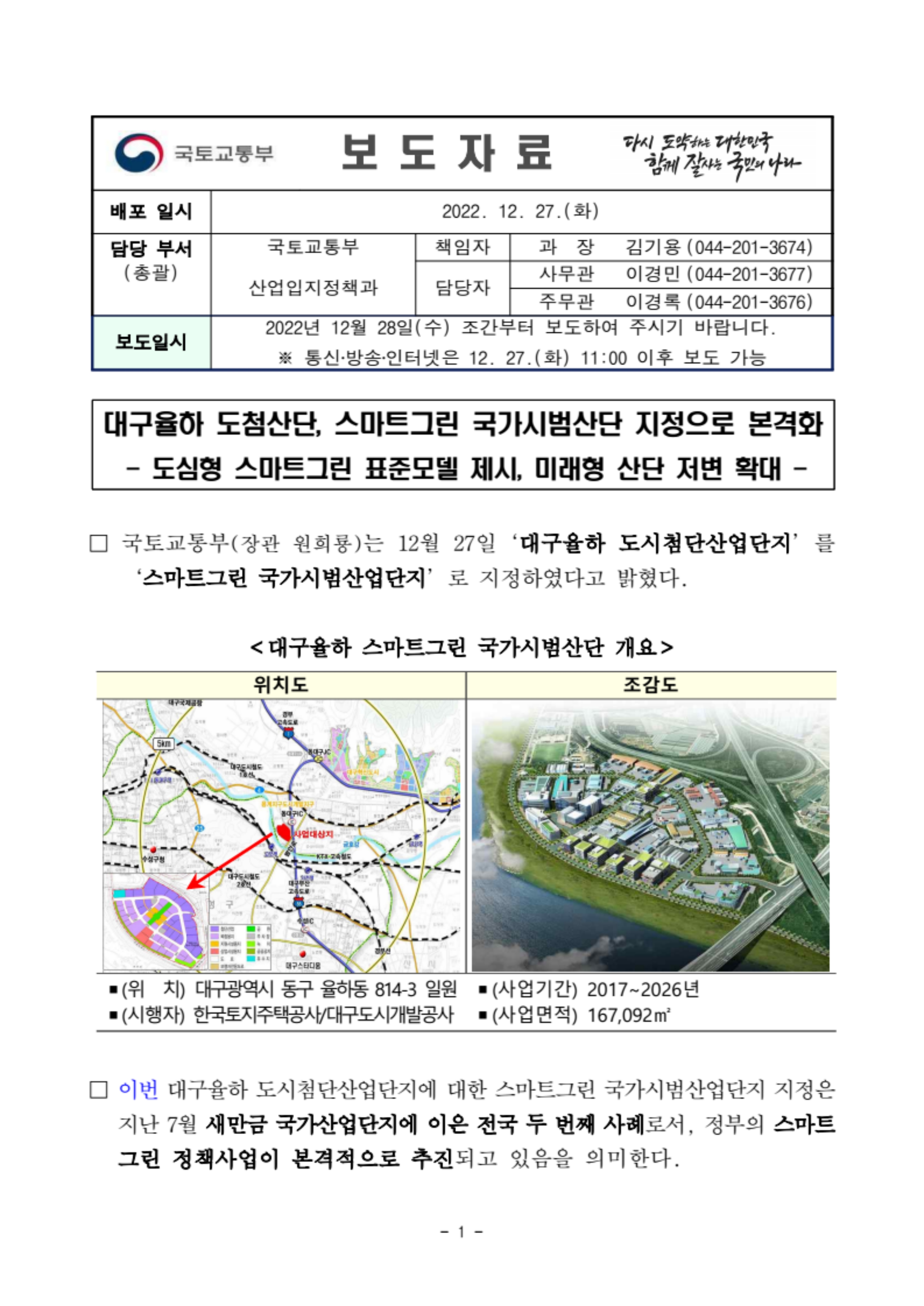 대구 율하 도시첨단 산업단지 스마트그린 국가시범산단 사업의 개요를 한번 살펴보시길 바랍니다.
