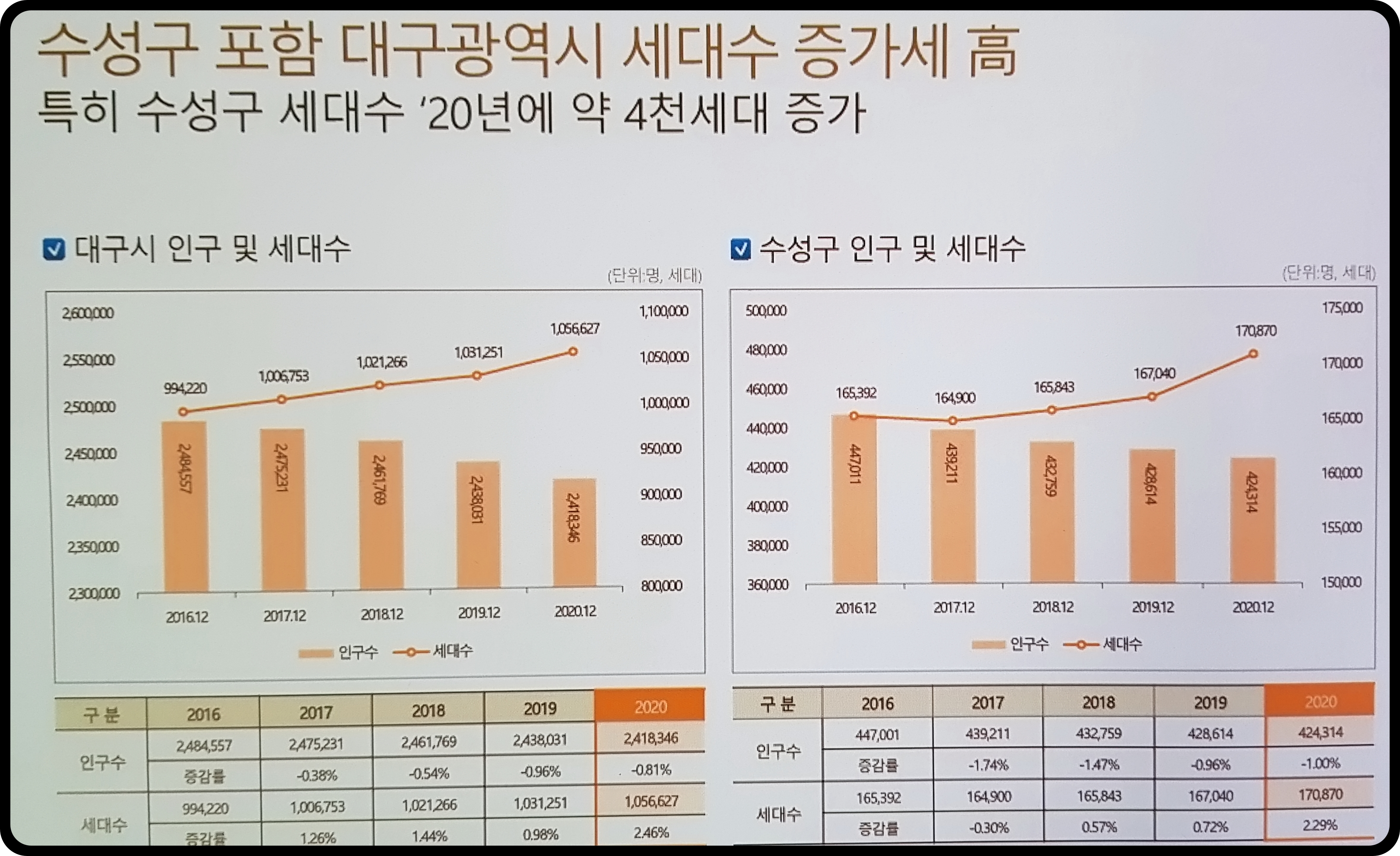 인구의 수는 소폭 하락했으니 세대수는 대폭 증가했습니다. 이 말은 세대분리가 조금 빠르게 진행이 되고 있다는 이야기가 아닐까 합니다. 우리가 말하는 독립이 이 이야기 일 수 있겠습니다.