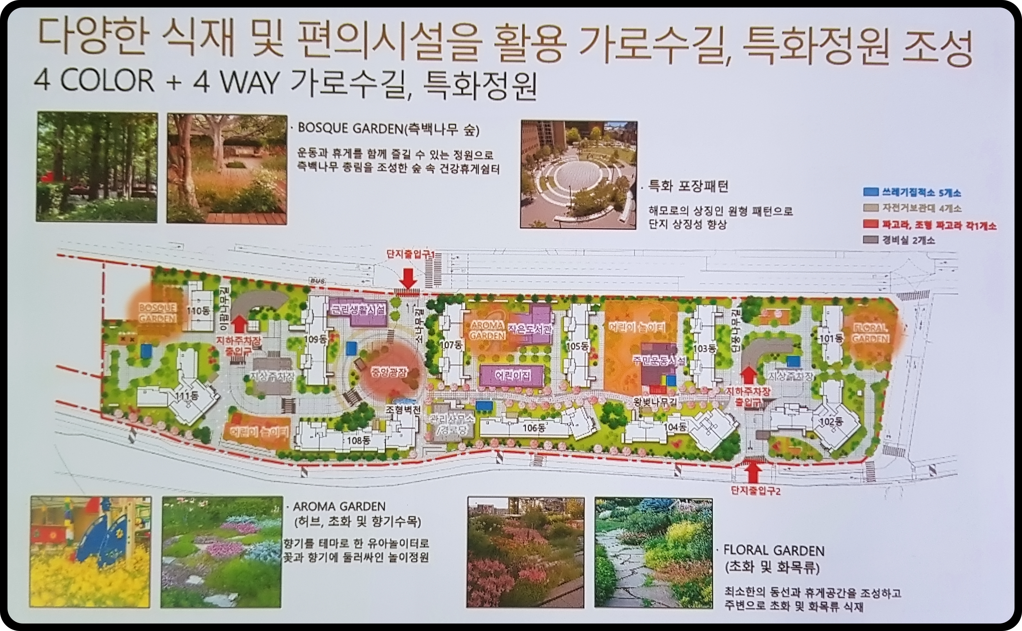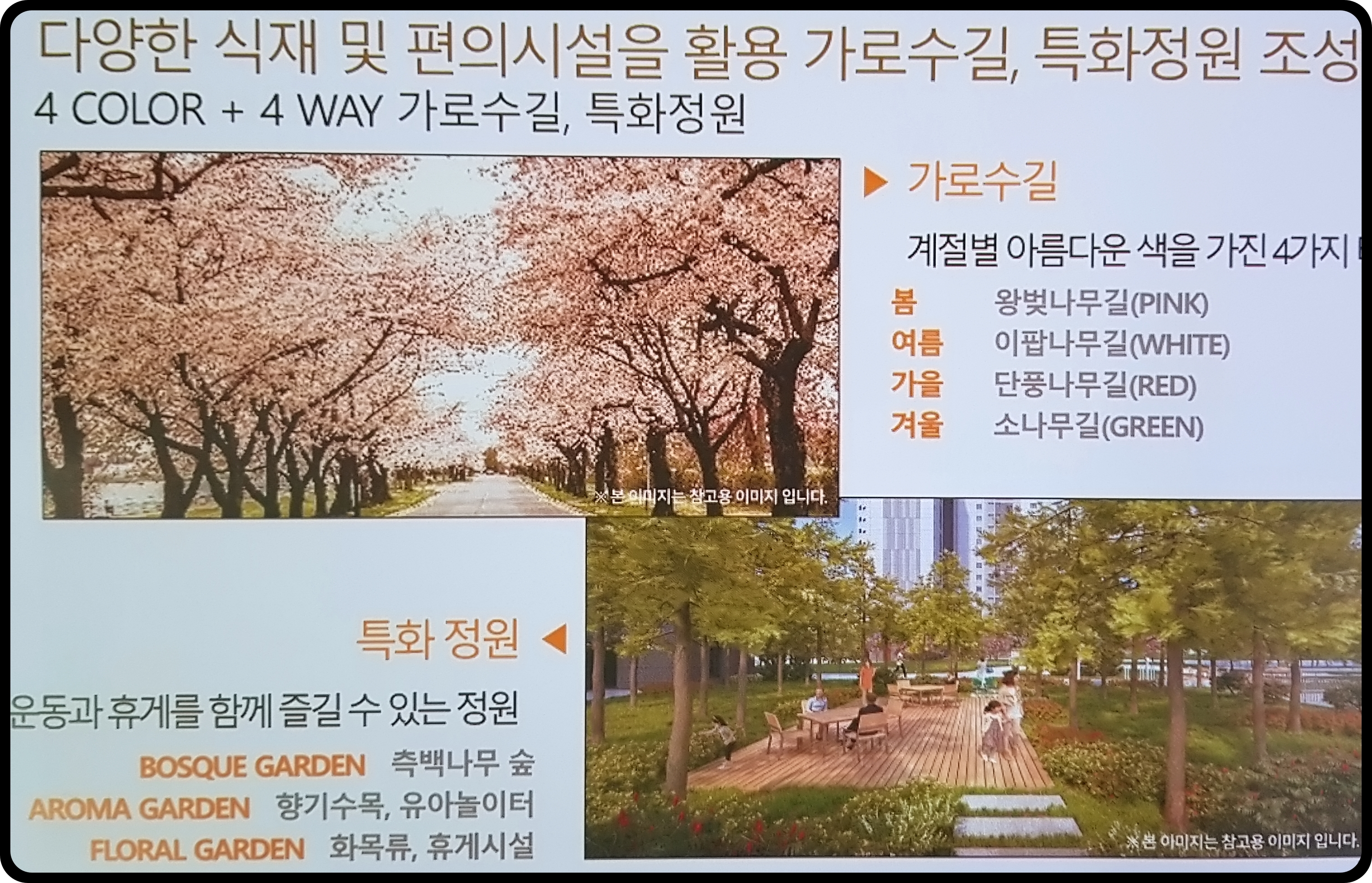 그리고 단지 내 아름다운 조경이 또 하나의 포인트로 주목을 받고 있답니다. 바로 이것들... 벚꽃나무길과 이팝나무, 단풍과 소나무길까지 사계절 모두를 즐겁게 하는 그 풍경이 벌써부터 기대가 된답니다.