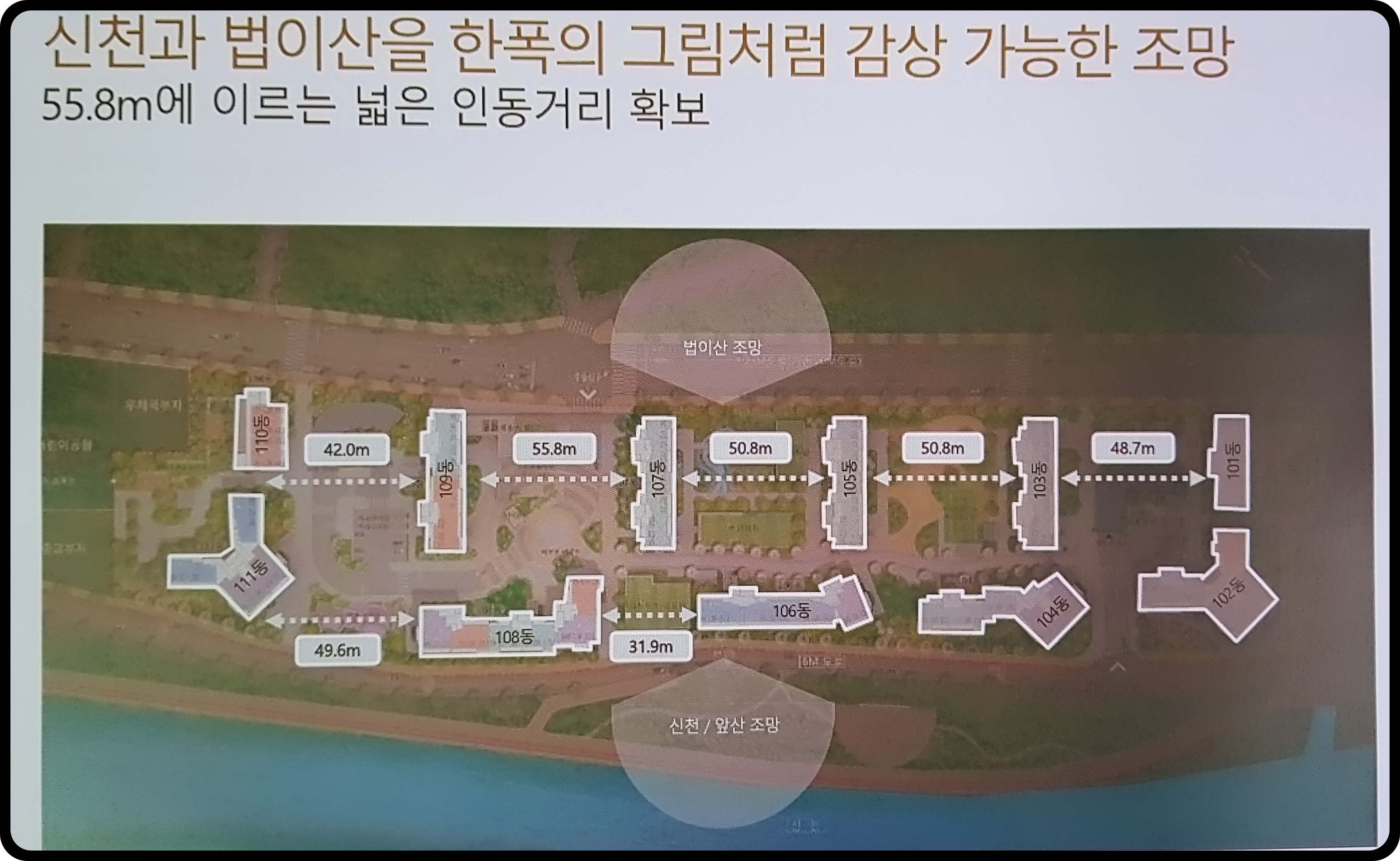 넓은 동 간 거리도 답답하지 않아 일상에서 받은 스트레스의 해소에 도움이 되실 겁니다. 법이산과 신천의 맑은 공기와 기운을 받고, 실내에서 탁 트인 조망과 우수한 채광이 또 인간에 알게 모르게 에너지를 북돋게 할 것 같습니다.